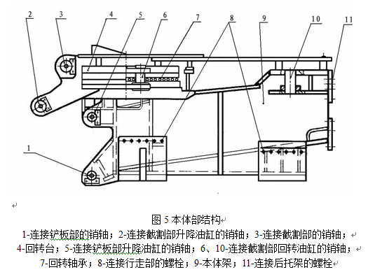 本體的右側上部(即圖紙后方)通過高強度螺栓連接液壓系統的泵站,左側上部(即圖紙前方)裝有液壓系統的操縱臺。前面上部2、3處通過回轉臺4和截割部升降油缸與截割部連接,回轉臺4在安裝于6、10之間的截割回轉油缸推動下,可繞回轉軸承7擺動。前面下部1、5處通過鏟板升降油缸和銷軸1連接鏟板部及第一運輸機機尾,第一運輸機從本體部中間穿過。本體部左、右側下部8處通過高強度螺栓分別與左、右行走部履帶架連接,后部11處通過高強度螺栓連接后支承部。