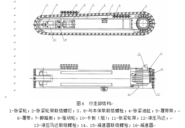 定量液壓馬達12通過行星減速器16及驅動輪9帶動履帶6實現行走。履帶6的松緊程度是靠張緊油缸4推動張緊輪托架11前后移動來進行調節的。張緊油缸為單作用形式,張緊輪伸出后靠卡板10鎖定,卡板的厚度分別為50mm、20mm、10mm、6mm,可隨意組合使用。張緊油缸、卡板均安裝在履帶外側,方便實用,并均配有蓋板以保證外形的美觀。液壓馬達、行星減速器均用高強度螺栓13、15與履帶架聯接。
